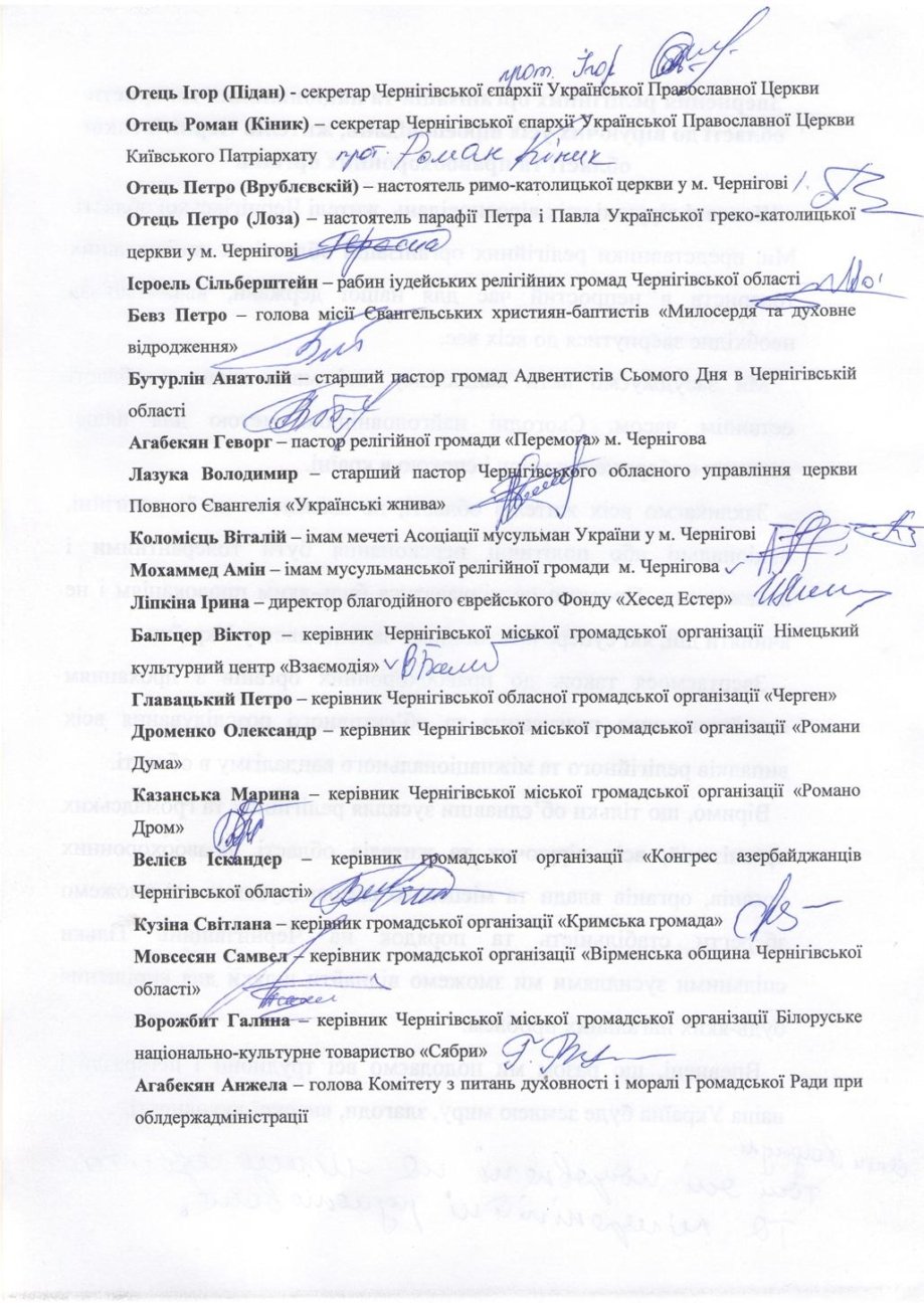 Під час зустрічі було сформульовано й підписано звернення релігійних організацій та національних товариств області до віруючих усіх віросповідань — жителів Чернігівщини, працівників ЗМІ та правоохоронних органів.