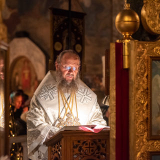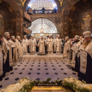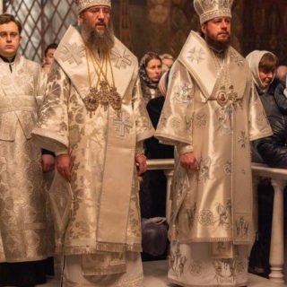 Предстоятелю співслужили намісник обителі митрополит Вишгородський і Чорнобильський Павел, керуючий справами УПЦ митрополит Бориспільський і Броварський Антоній, архієпископ Бучанський Пантелеімон, єпископ Баришівський Віктор, єпископ Білогородський Сильвестр, єпископ Ірпінський Лавр, єпископ Бородянський Марк та духовенство монастиря.
