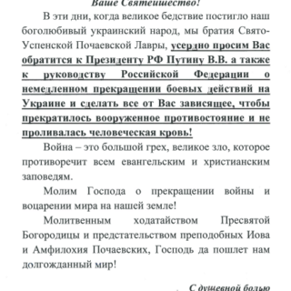 У ці дні, коли велика біда спіткала наш боголюбивий український народ, ми братія Свято-Успенської Почаївської Лаври, усердно просимо Вас звернутися до Президента РФ Путіна В.В., а також до керівництва Російської Федерації про негайне припинення бойових дій в Україні та зробити все від Вас залежне, щоб припинилося збройне протистояння та не проливалася людська кров!