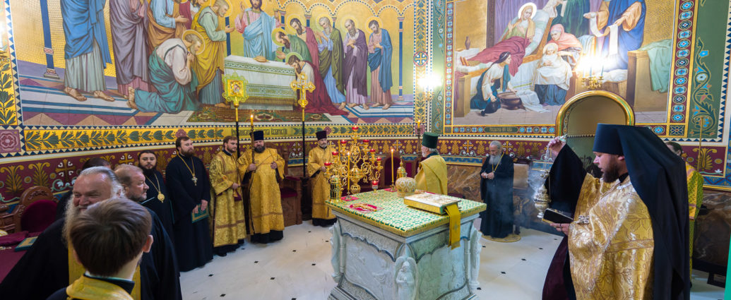 Предстоятелю співслужили голова Відділу зовнішніх церковних звʼязків УПЦ митрополит Чернівецький і Буковинський Мелетій, архієпископ Білогородський Сильвестр, єпископ Ірпінський Лавр, єпископ Бородянський Марк, духовенство храму та гості у священному сані.