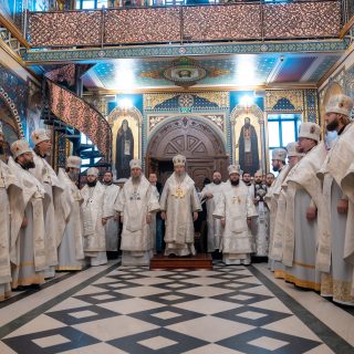 Предстоятелю співслужили керуючий справами УПЦ митрополит Бориспільський і Броварський Антоній, архієпископ Ірпінський Лавр, архієпископ Бородянський Марк та братія обителі у священному сані.